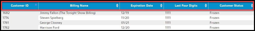 - Frozen: Display only frozen customers with Expiring Credit Cards.