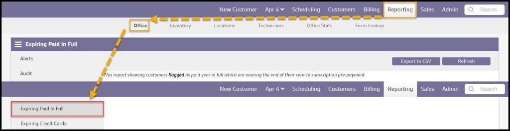 The Expiring Paid in Full Report makes it easy to keep track of the customers who pre-paid for their service. This report shows customers flagged as paid year in full, which are nearing the end of their pre-paid balance.