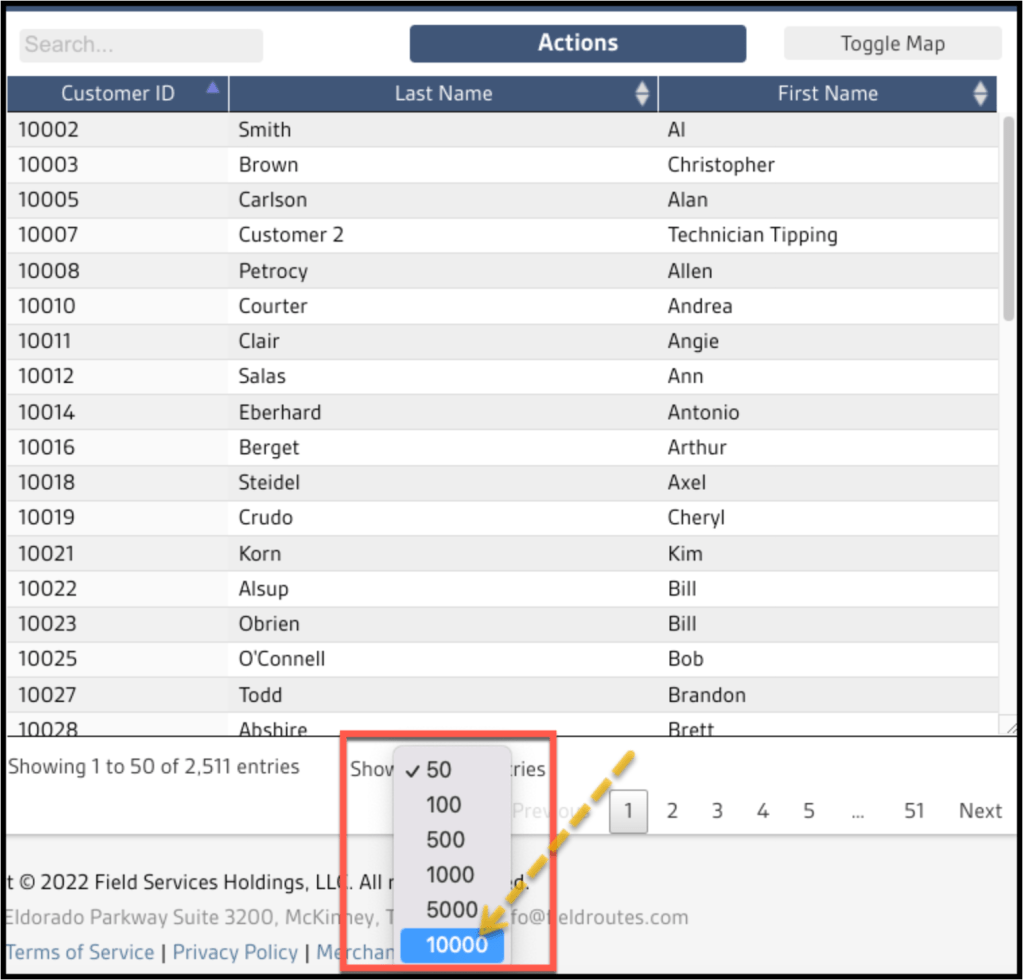 At the bottom of the Customer list, find the Show xxx entries field. Change the default value by selecting 10,000 from the drop-down menu.