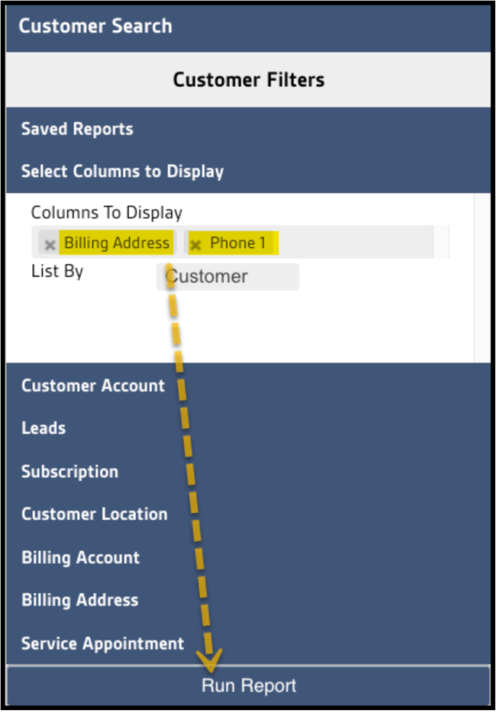 - By default, the customer list provides Customer ID, First Name, and Last Name. Additional info can be added to the Export from the Select Columns to Display field.