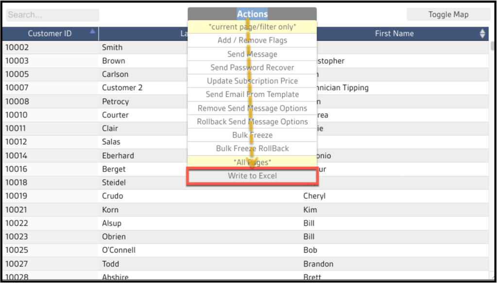 Finally, once the list in the Customers Report contains the desired data organized by either Customer or Subscriptions, export the data to a CSV file.
