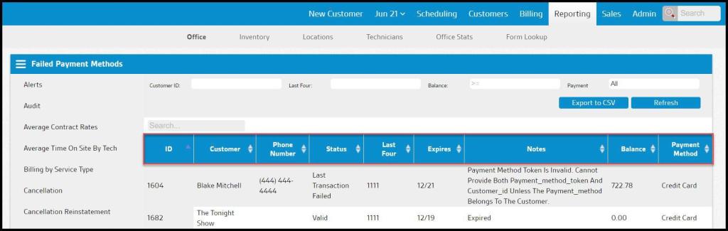 The Failed Payment Methods Report shows all AutoPay customers whose last payment failed.