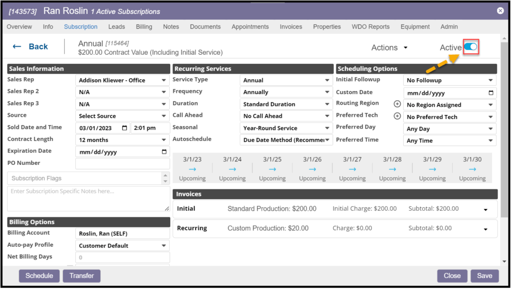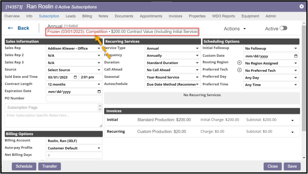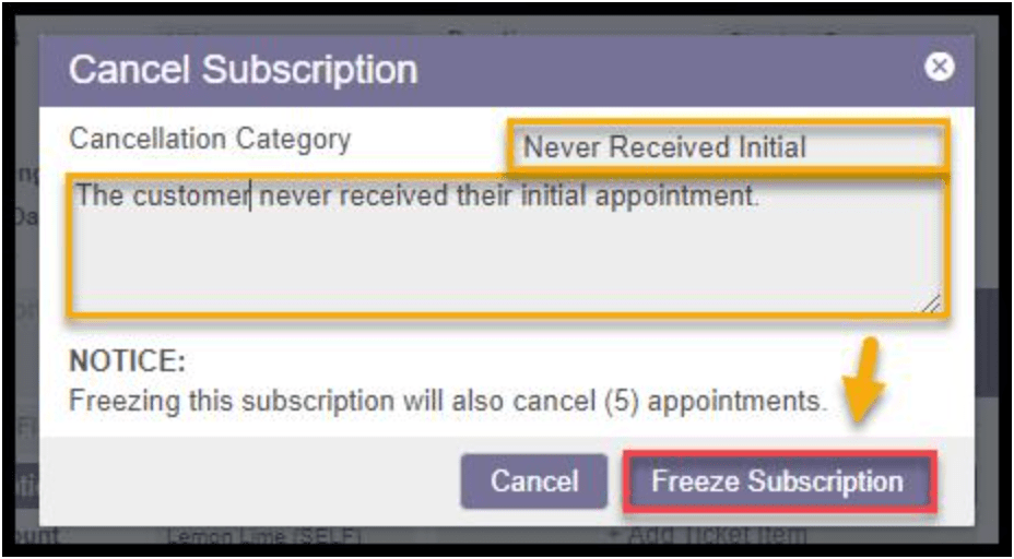 Freezing a subscription still leaves all the subscription data on the desktop application, such as past services, invoices, etc. Any future appointments already on the schedule will not be frozen and must be manually canceled. Frozen subscriptions can be reactivated anytime by clicking Activate.