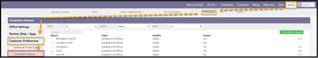 Admin > Preferences > Customer Preferences > Cancellation Reasons. See more information in the Cancellation Reasons guide.