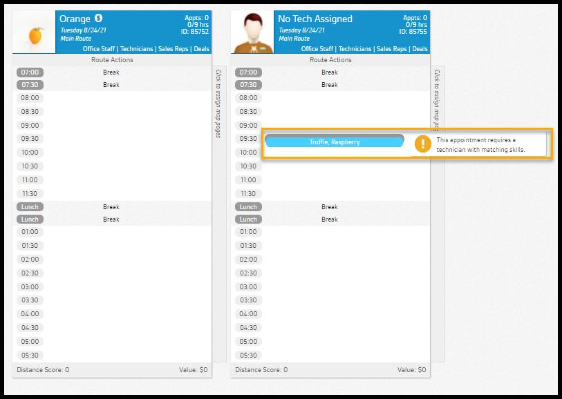 If a route is scheduled and the technician’s skills do not match the appointment, that will be noted in the details about the appointment. If only one technician’s skillsets match the appointment, then it will still show up as a match.