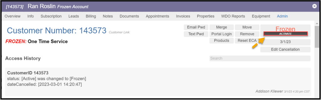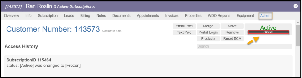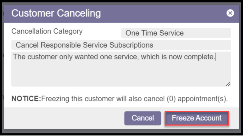 Once “Freeze” is selected, a prompt will appear for entering a cancellation reason. The user must enter a reason for canceling the customer. Select Freeze when finished. This will save in the access history in the Admin Tab.