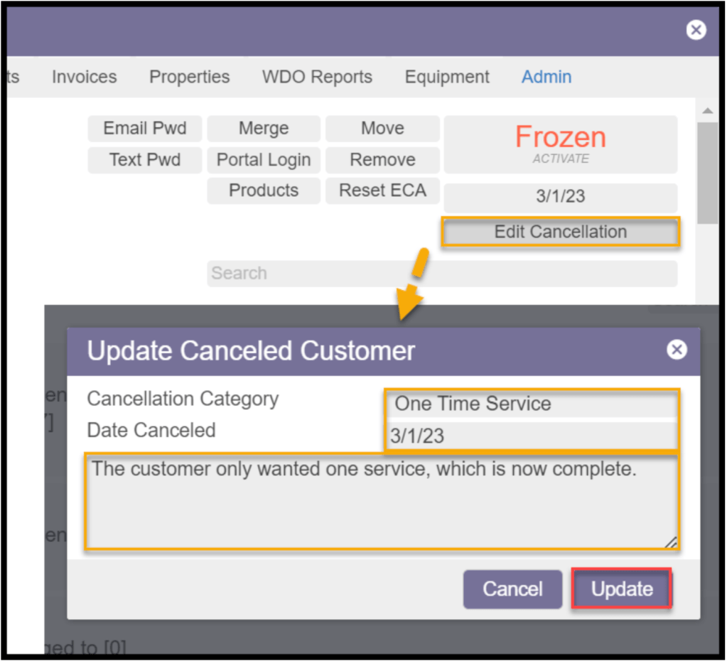 A cancellation reason can be updated by selecting the Edit Cancellation option. Enter the new reason and choose the Update option.