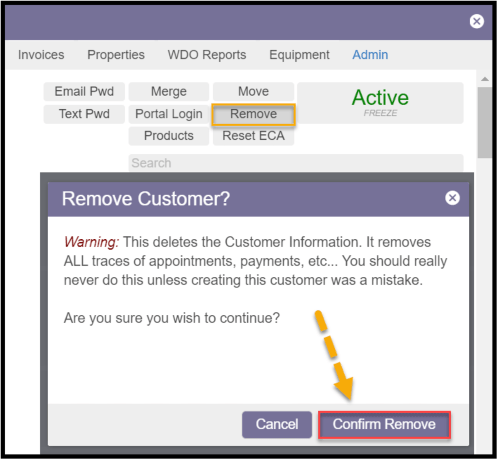 To completely remove all the information related to a customer, the customer can be deleted by going to the Admin tab and selecting “Remove.” Confirm to remove the customer, and the Customer Card will disappear. Everything associated with the customer, including invoices, subscriptions, and appointments, will be completely removed from the desktop application. Deleted customers can be recovered in the Customer Restore Report, see the Customer Restore Report guide for more information.