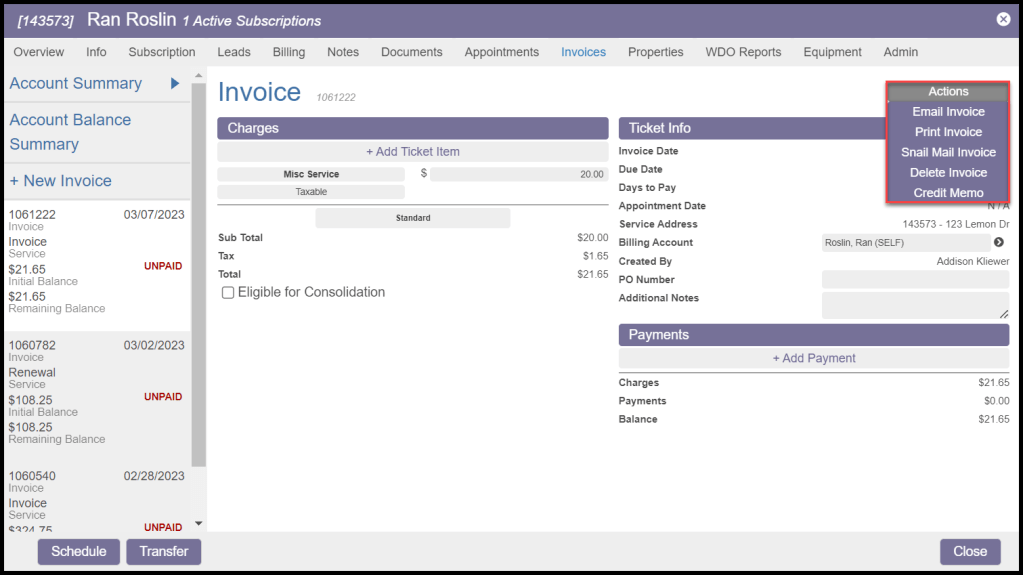 - Email Invoice: Email an individual invoice to the customer. The Billing tab email address will be used to email the invoice.
