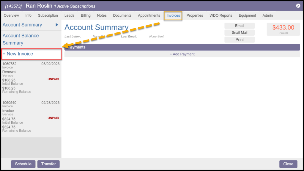 Although this invoice can be connected to a service type, it cannot be connected to an appointment. Since it cannot be connected to an appointment, the Appointment Date will say N/A.