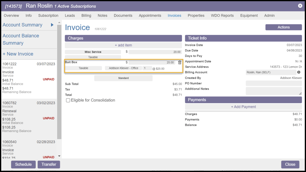 When the Add-ons are applied to the invoice, they will appear under the Charges section.