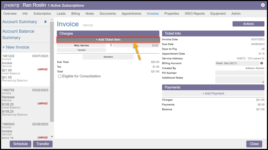 Add-ons can be applied to the invoice as well. Select + Add Ticket Item under the Charges section, and a list of Add-ons will appear.