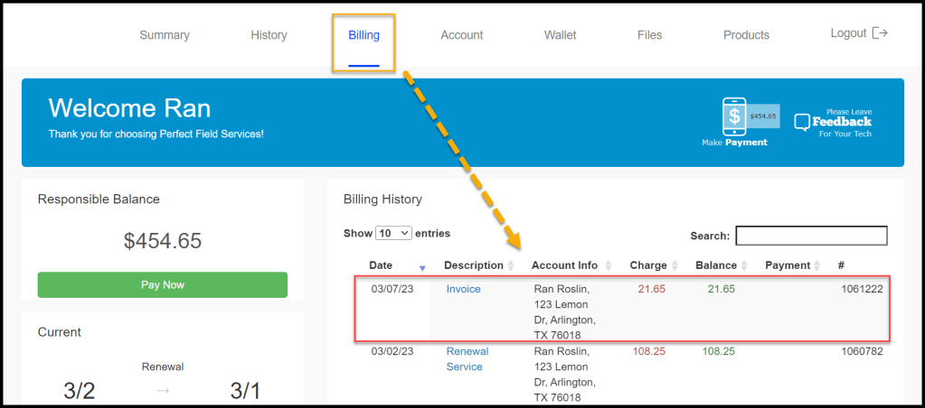 The newly created invoice is also visible in the customer portal under the Billing tab.