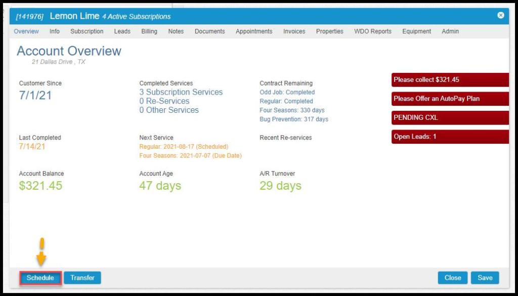 The customer’s appointment can be scheduled via the customer card. Open the customer card, and select Schedule in the lower left corner.