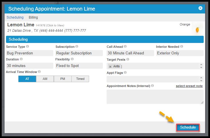 After entering the appointment details, select Schedule to schedule the customer on the route.