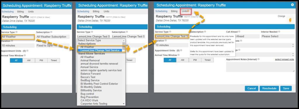 - Scheduling: Indicates the Products for the appointment will reflect the new service type and remove all products which were previously set.