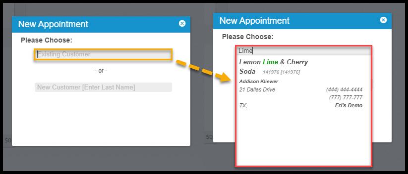 - Existing Customer: Use this field to search for an existing customer. There are options to search by first name, last name, customer ID, physical address, and phone number. Type in three or more characters for search results to appear. Once the user selects the customer, the appointment card will appear.
