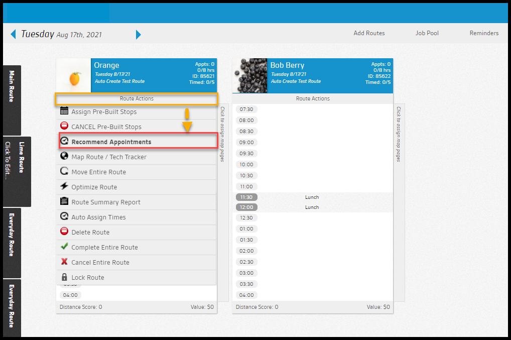 Select Route Actions on the desired route, and then click on Recommend Appointments. This will prompt the Job Pool to pop up.