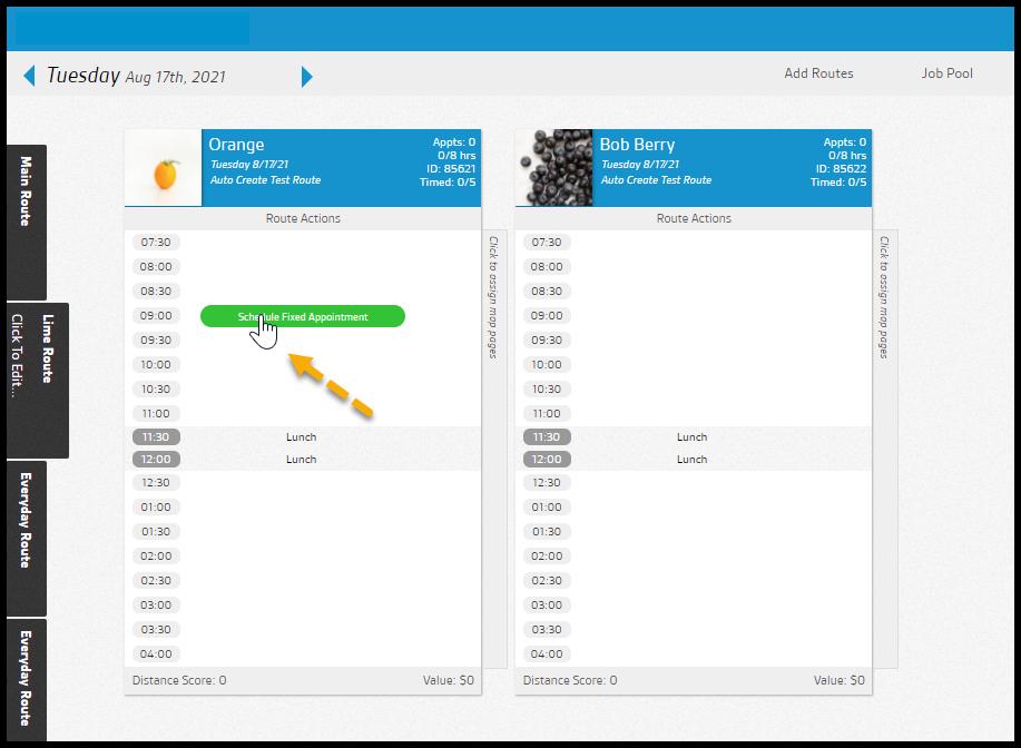 Hover your mouse over an open slot on a route, and the option to Schedule Fixed Appointment will appear. Select the slot to bring up the New Appointment window.