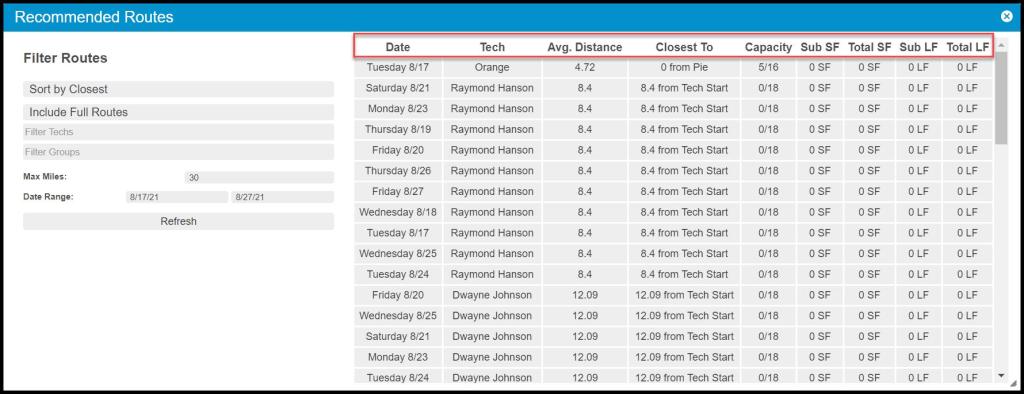 The Recommended Routes window makes it easy to choose the best routes to schedule customers on. Several filters will allow you to find the best route for the customer.