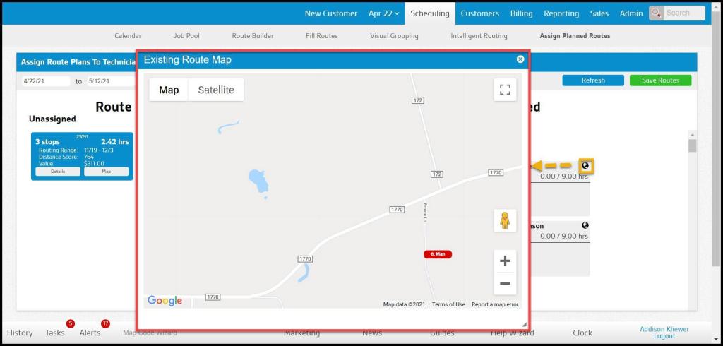 To schedule a pre-built stop onto a technician’s route that already has scheduled appointments, you can easily view the maps for both routes and determine if that pre-built route fits the technician’s current route.