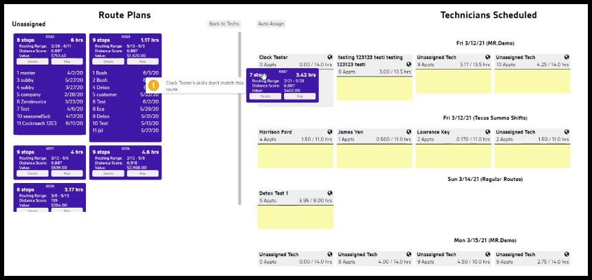 From there, drag and drop the routes onto the technician’s days or select “Auto Assign” to automatically assign the routes from that group to available technicians. If the technician’s skills do not match the appointment, a notification will warn the user of the skills mismatch. If a planned route is assigned to a skills mismatch, the software will warn the user that the technician does not have the skills required for the assigned route.