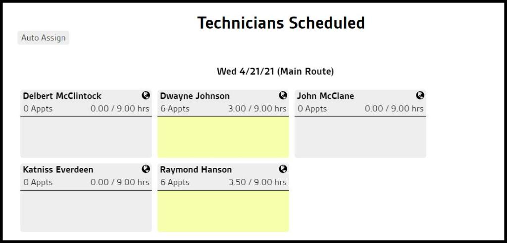 Under the “Technicians Scheduled” section, you’ll notice a block for each technician. A gray block means the technician has a completely empty route for that day. A yellow block indicates the technician has a previously scheduled appointment for that specific day.