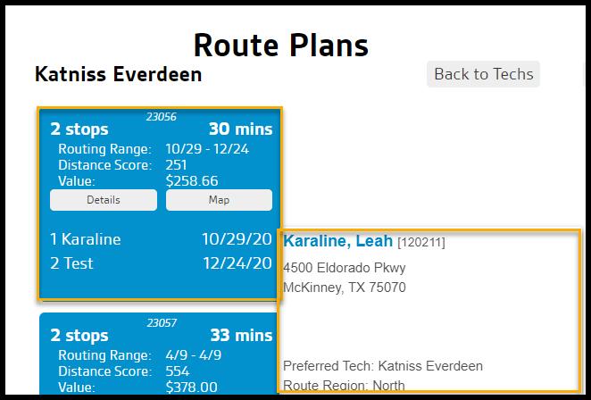 Under Route Plans are all of the optimized routes created in Intelligent Routing, sorted by preferred technician or region. Select the technician or region to view the routes made for that group.