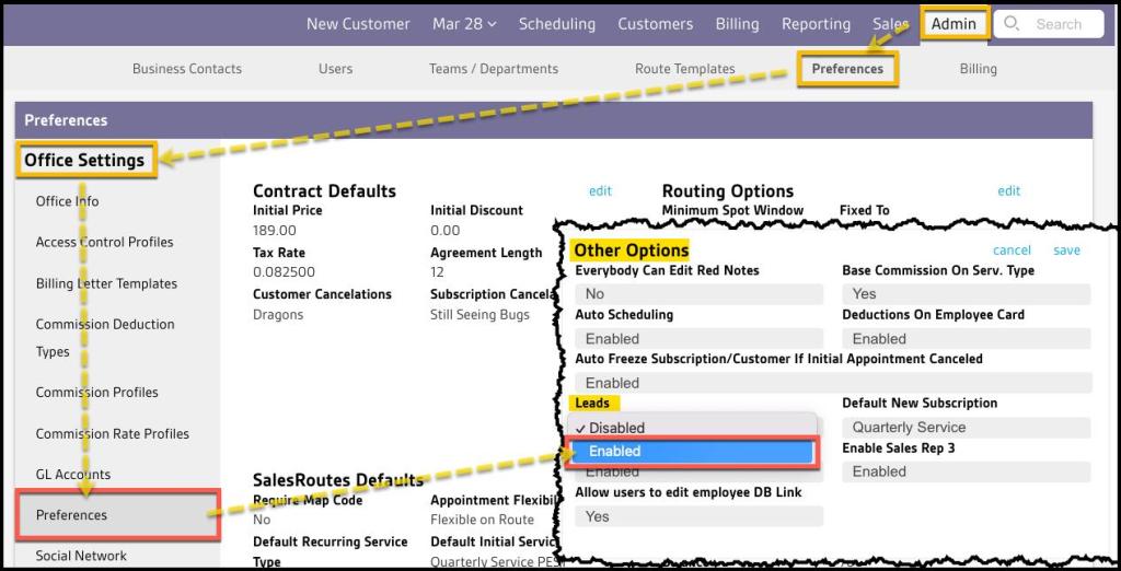 - If the Leads Report is not visible as a sub-menu under the Customer area, check that the Leads feature is enabled in Admin > Preferences > Office Settings > Preferences > Other Options > Leads.