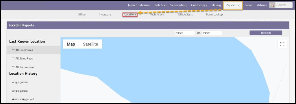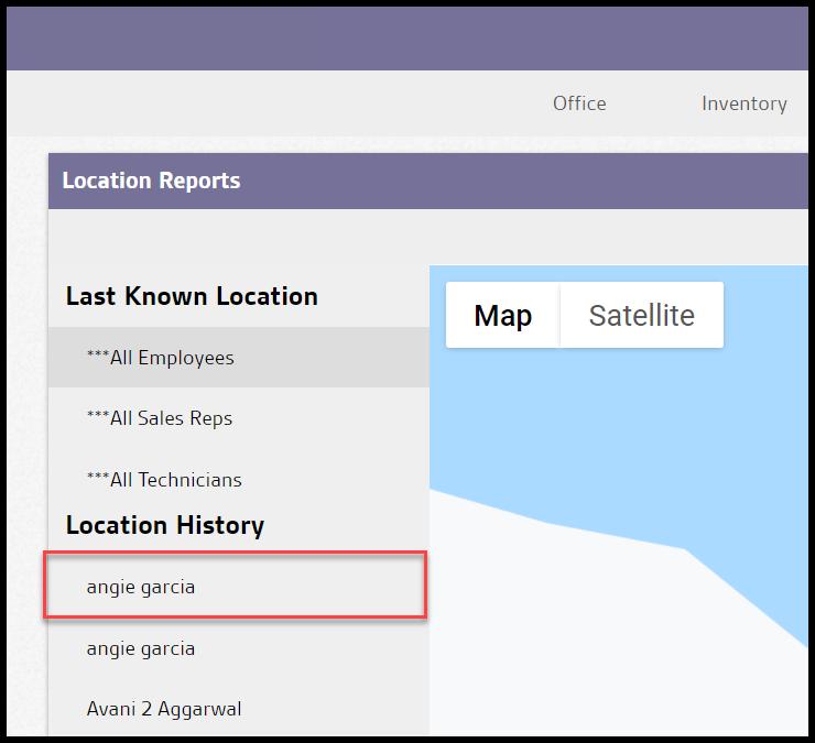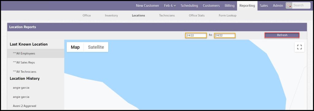 The Locations Report is used to track where technicians and sales users have been by following where the mobile applications have reported their location.