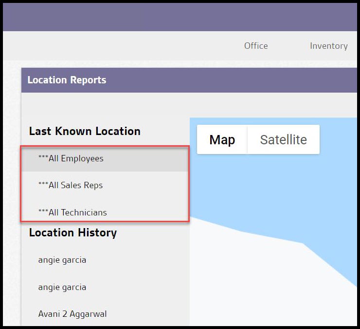 To filter by an employee type, go under Last Known Location >“All Employees,” “All Sales Reps,” or “All Technicians.” When selecting one of the employee-type filters, only each user’s last known location within the date range will be displayed.