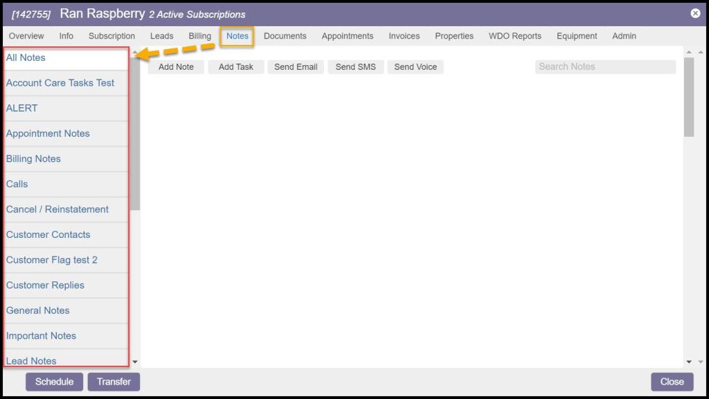 Specific Note Categories can be selected to the left to view all the Note Types in the category.