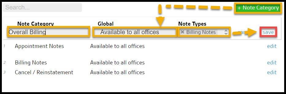 To add a new Note Category, select + Note Category or edit to make changes to an existing Note Category.