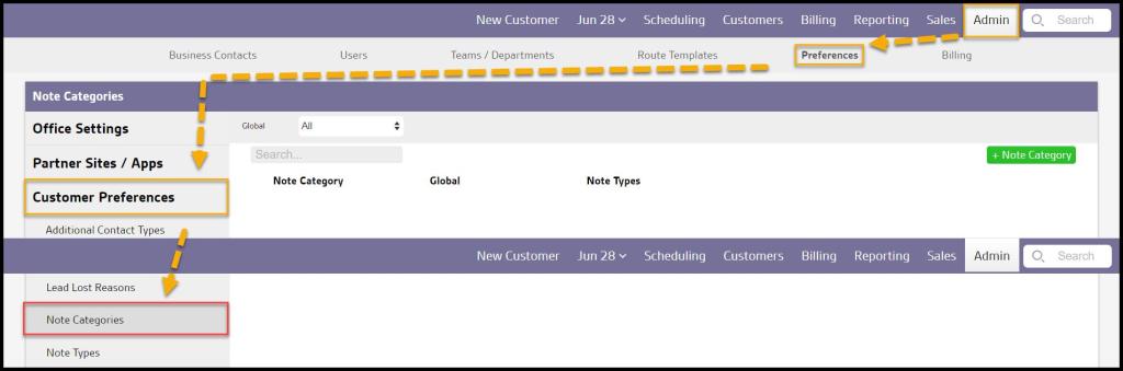 - When a note is created in the Customer Card, a Note Type can be assigned to it. That Note Type can be organized by Note Category.