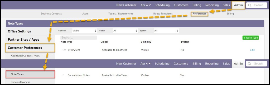 - A Note Type can be assigned when creating a note in the Customer Card. That Note Type will be organized under its broader Note Category. Please see the guide on Note Categories for more information.