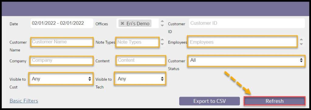 - Customer Status: Search for notes based on the customer’s status.