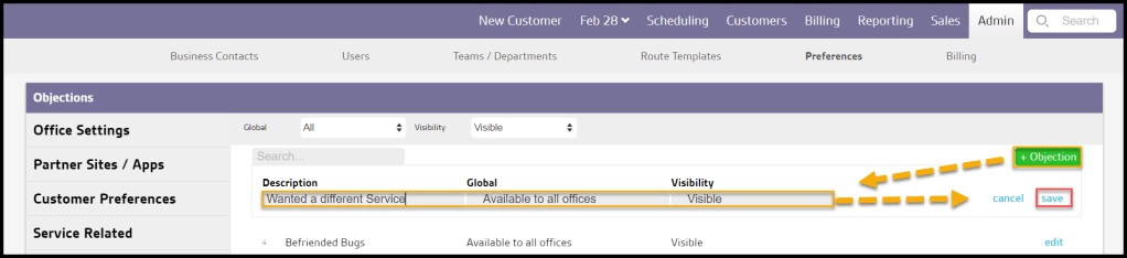 The Objections preference is used to identify and track why customers are declining services. This preference allows users to organize customers while knocking. Please see the Closing Through Objections guide for more information on how to close through a sale. Objections can be created in the Preferences section.