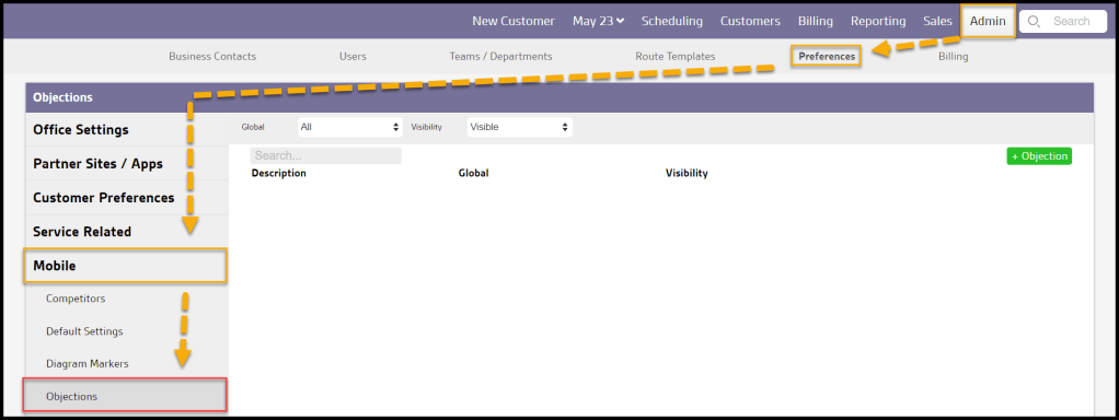 Admin > Preferences > Mobile > Objections.