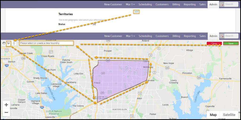 If this section is edited, a map will be shown where boundaries can be drawn for office service Territory. Also, if there is more than one office, all the Territories can be drawn and assigned from one office.