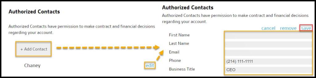 Authorized Contacts have permission to make the contract and financial decisions regarding your account. To edit the Authorized Contacts, select edit near the Authorized Contacts or + Add Contact to add a New Contact. There is a maximum of two Authorized Contacts.
