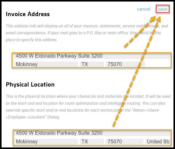 - Physical Location: The physical location where office’s chemicals and materials are located. It will be used as the start and end location for route optimization and Intelligent Routing. Each technician’s specific start and/or end locations can be overridden under Admin > Users.