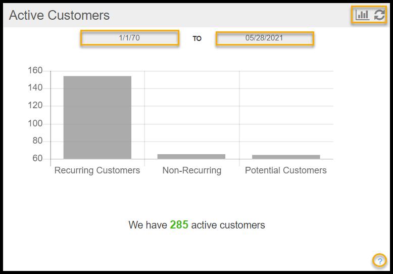 Any of these customers can be viewed on the customer report by clicking on that slice of the pie on the widget. The date filters for the Active Customers widget will only show those customers who were added (created) within the selected time period.
