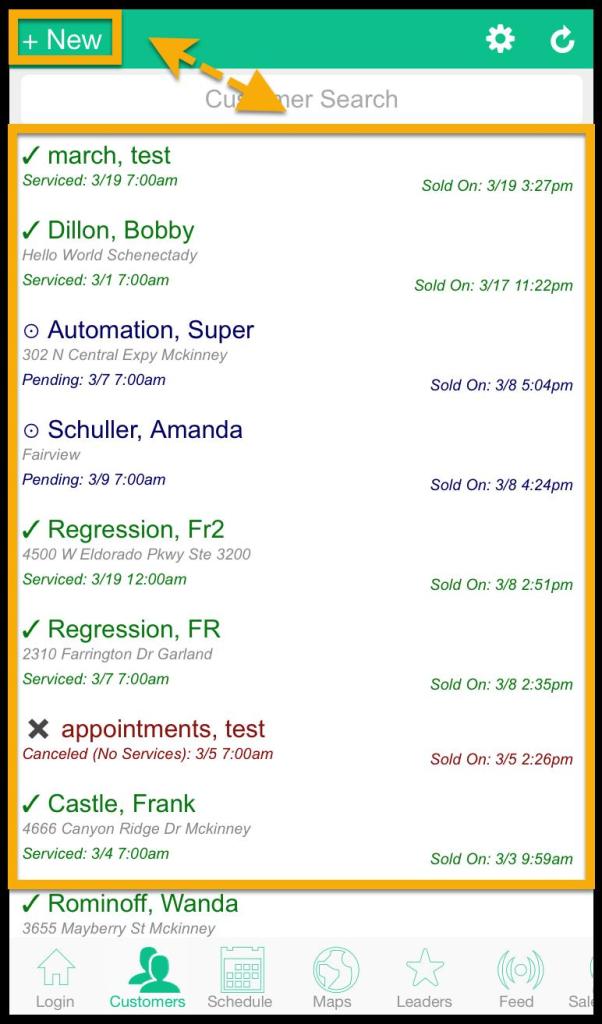To add or edit customers in PestRoutes Sales, press + new to create a new customer in PestRoutes Sales, or tap an existing customer to edit a customer from the user’s list.