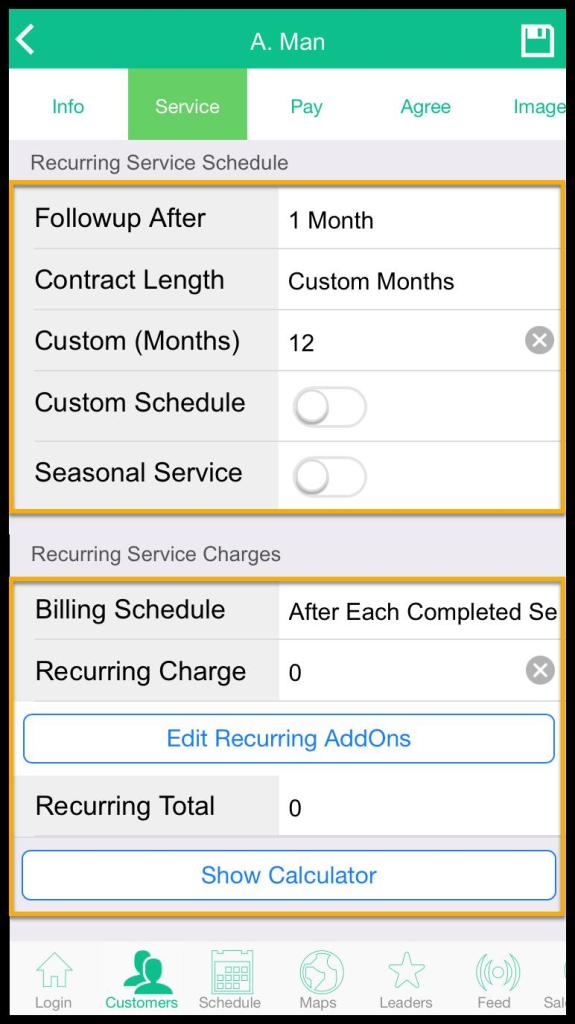 Service tab: Recurring Service Schedule