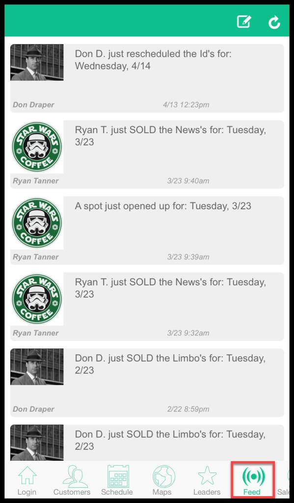 The Feed shows sales the sales representatives made on that day and appointment spots that have opened up.