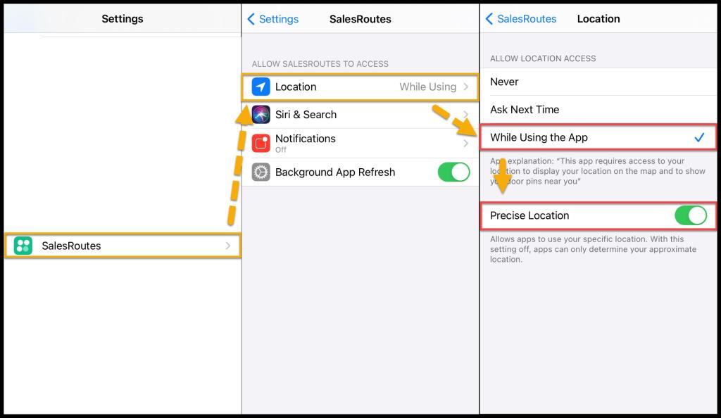 Settings > PestRoutes Sales > Location > Allow while using.