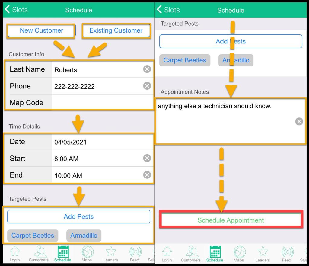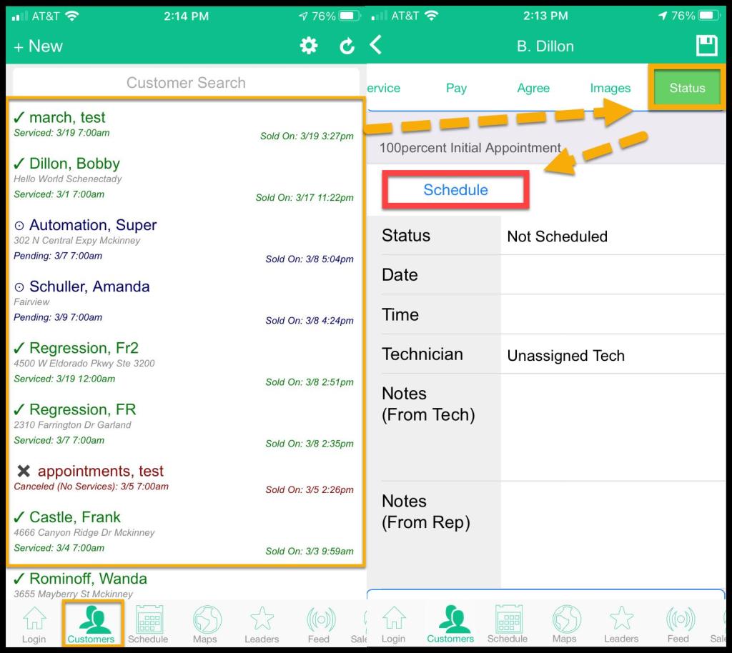 Open the PestRoutes Sales App > Customers > Open the desired Customer > Schedule > Status > Schedule.