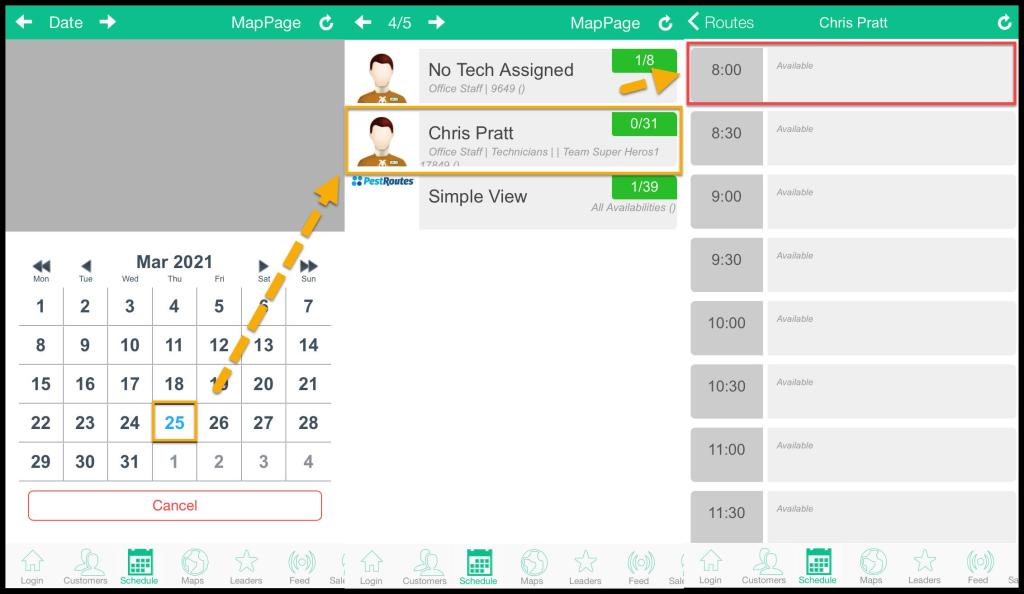 Tap the date from the calendar > tap the desired technician available > tap the hour to schedule a time for an appointment for that day.