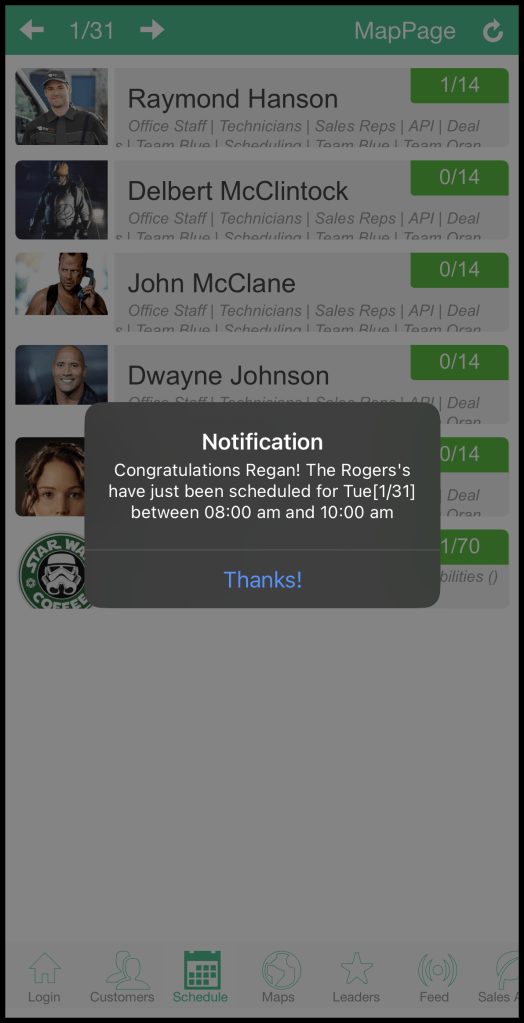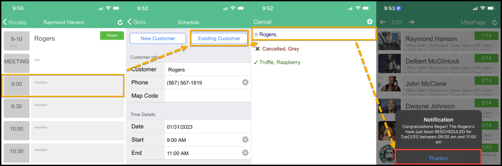 - Choose the desired customer from the list with all the customers the sales user has sold (they cannot reschedule a customer if they have not sold the customer).