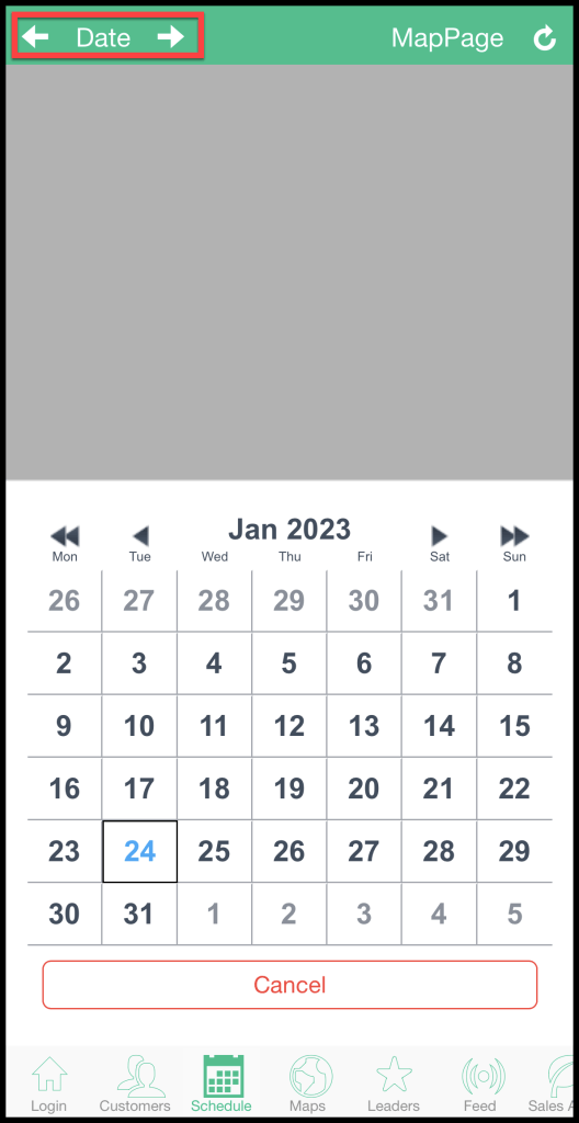 To access the schedule in PestRoutes Sales, press the Schedule tab at the bottom of the page.